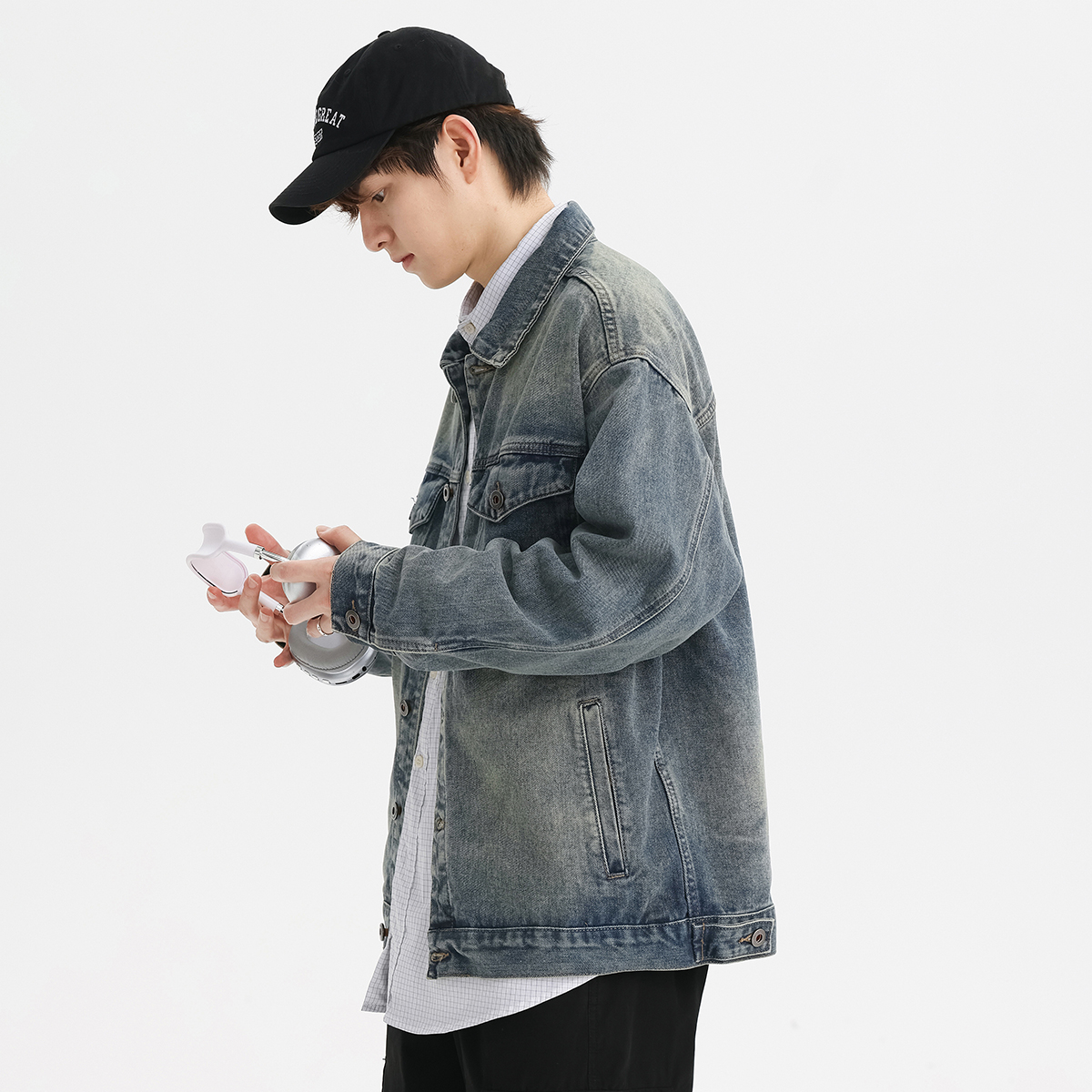 唐狮2025秋季 牛仔外套女巴恩风复古做旧潮牌宽松撞色翻领夹克 新款