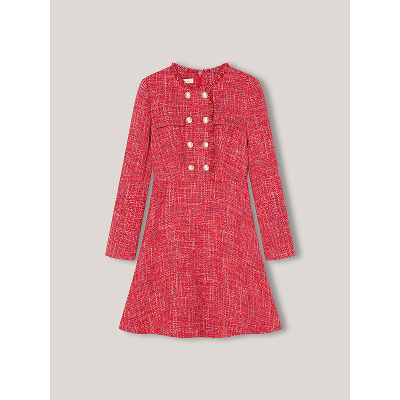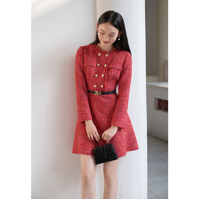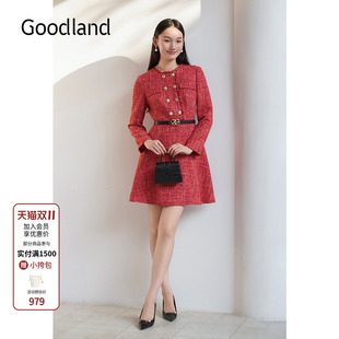 Goodland美地女装 红色粗花呢小香风连衣裙收腰a字裙 2024年冬新款