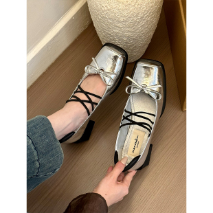 女2025年夏季 小香风玛丽珍鞋 新款 平底浅口单鞋 法式 热风银色晚晚鞋