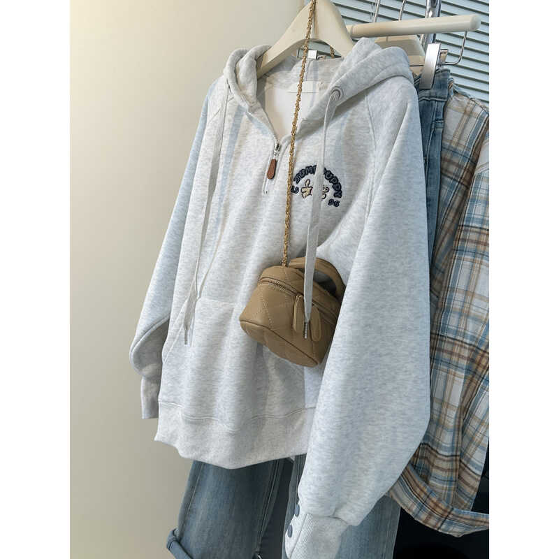 卡通刺绣外套上衣潮牌 宽松韩版 半拉链连帽卫衣女2024春秋新款 薄款