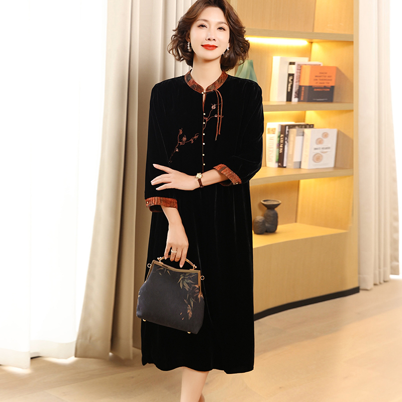 新款 阔太太高贵精致裙子春秋 复古真丝丝绒连衣裙女桑蚕丝新中式