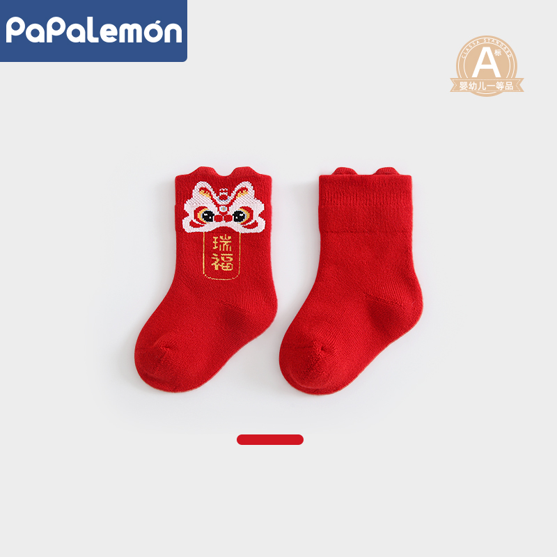 柠檬爬爬新生婴儿袜子秋冬季 宝宝拜年喜庆满月红色加厚保暖中筒袜