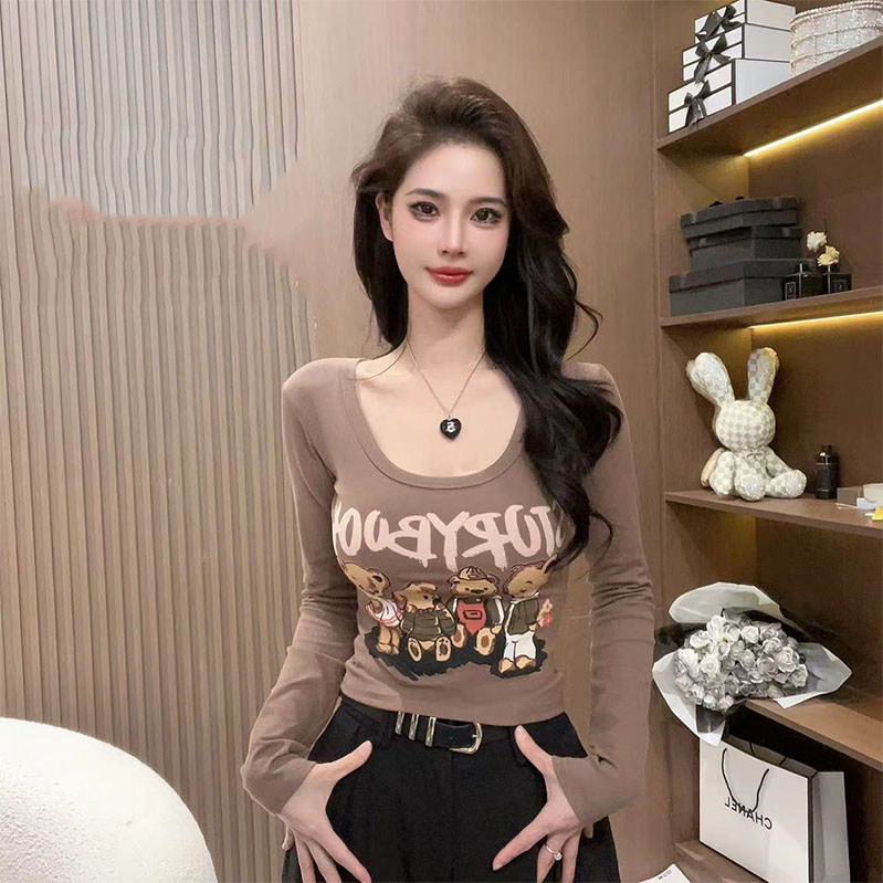 设计卡通印花春秋季 短款 修身 t恤辣妹长袖 打底U领上衣 显瘦时尚 韩版