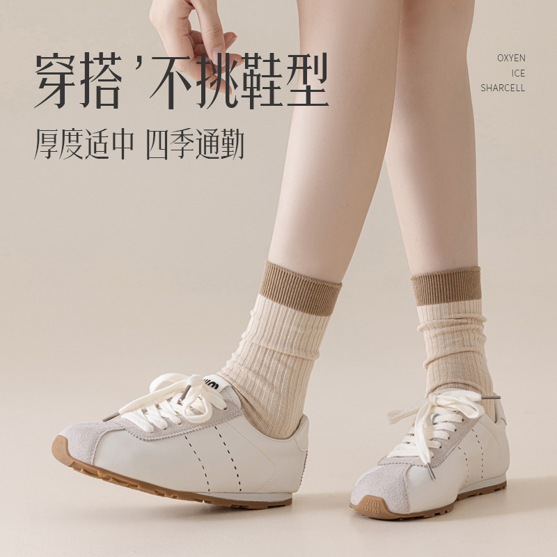 爆款 袜子女纯棉春秋款 中筒袜防臭撞色复古堆堆白色长袜2025新款