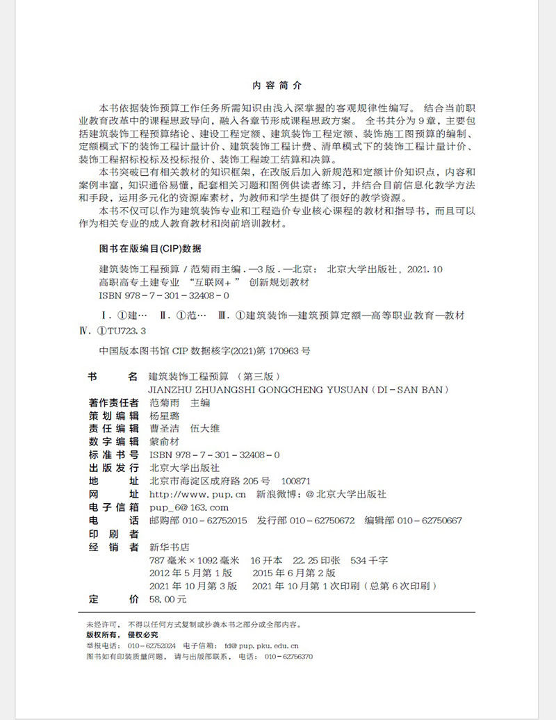 饰工程预算 建筑装 第三版 范菊雨 社9787301324080 正版 北京大学出版 2021新书