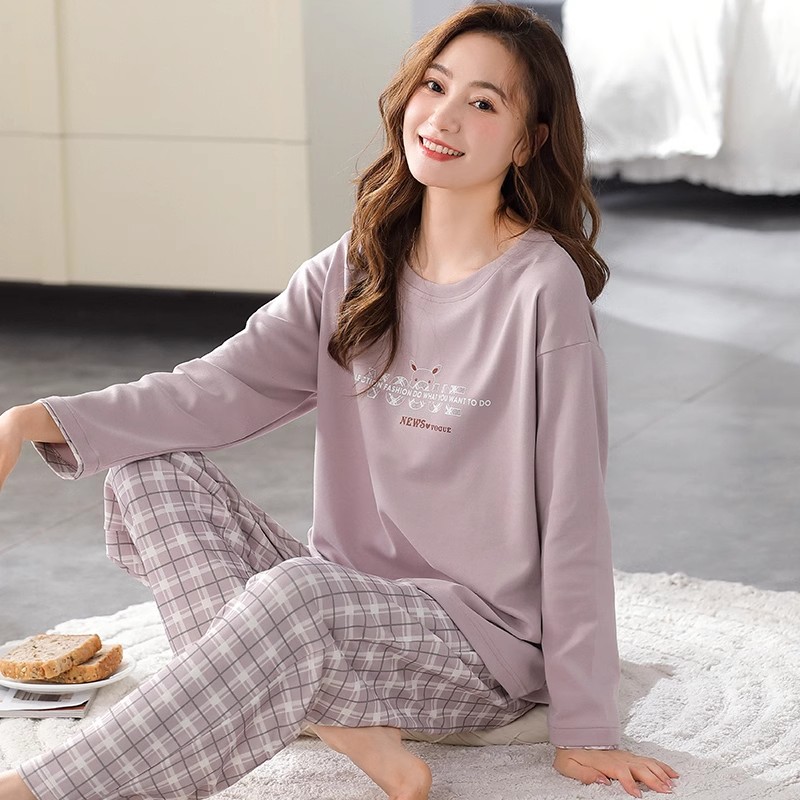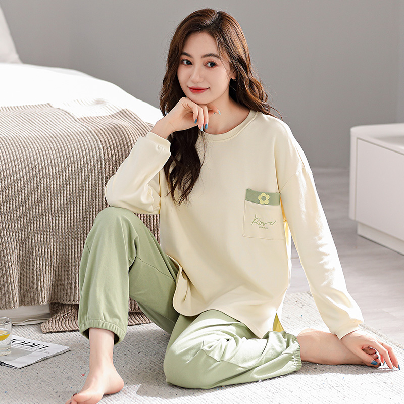 男春秋 带胸垫家居服套装 A类抗菌防螨纯棉情侣睡衣女长袖 红豆夏季