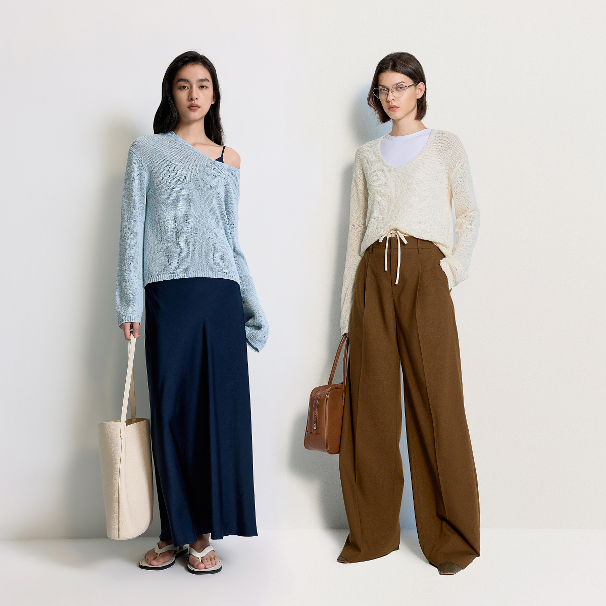 女上衣落肩2025秋冬新品 针织衫 莱赛尔V领长袖 OCHIRLY欧时力