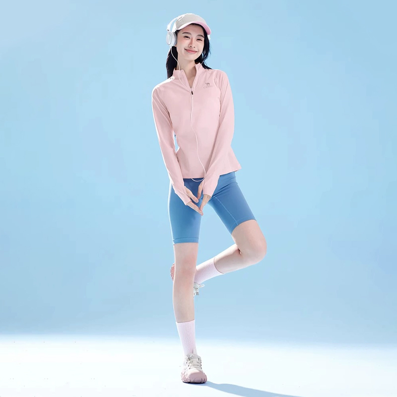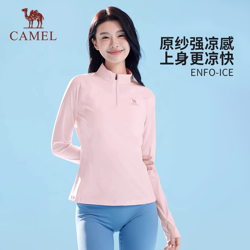 立领春秋弹力透气徒步防晒T恤 骆驼户外速干T恤女长袖 原纱凉感