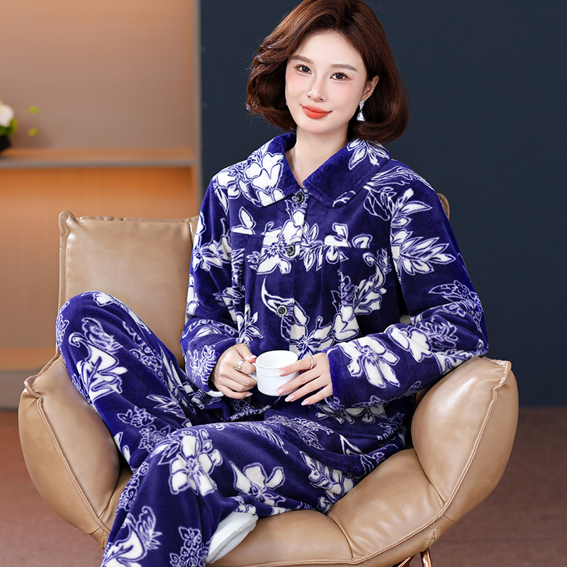 睡衣女秋冬中老年加厚套装 春秋婆婆珊瑚绒法兰绒 妈妈奶奶保暖长袖