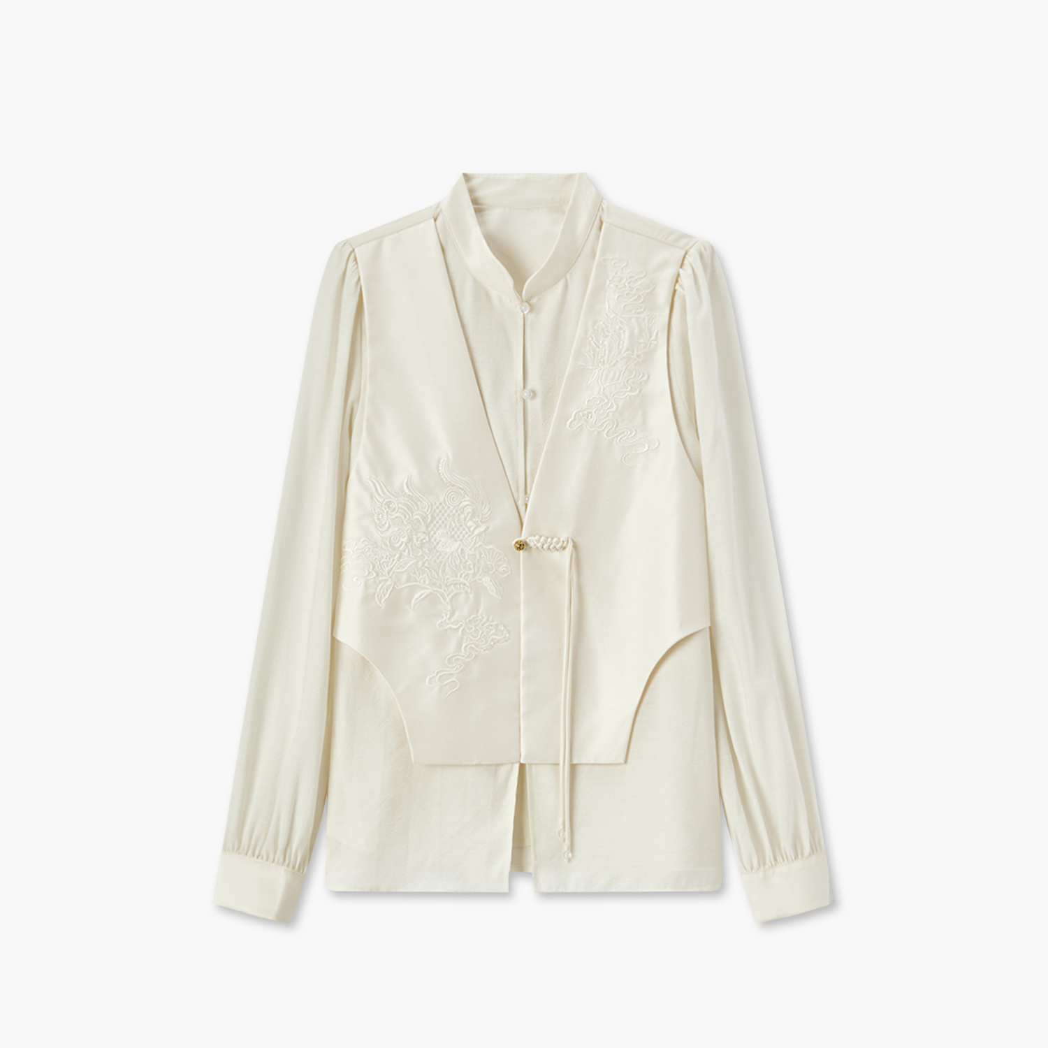 新款 女秋季 叠穿日系复古V领马甲背心 衬衫 白色抽绳设计感宽松长袖