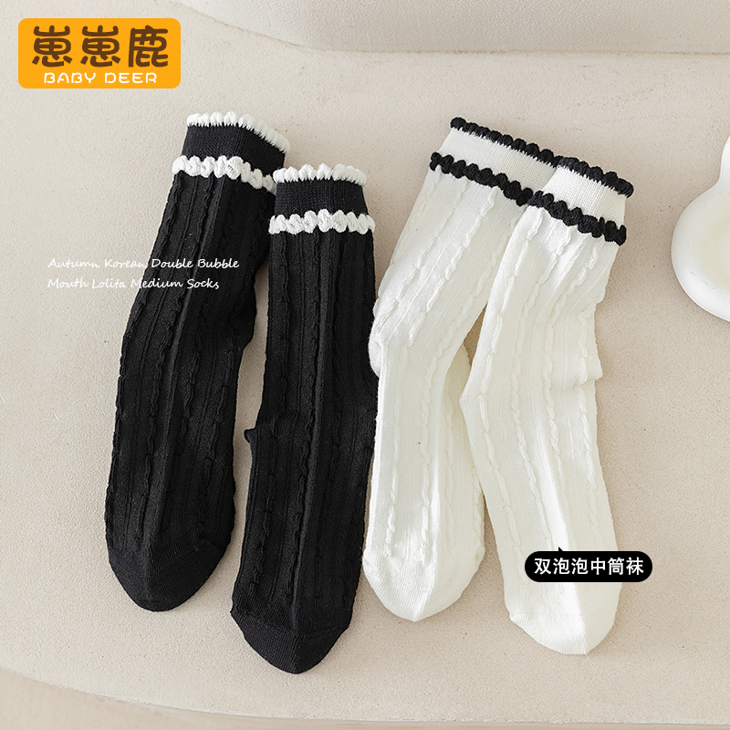 学院风大女童袜子春秋纯棉学生黑白花边儿童秋冬配裙子无骨中筒袜