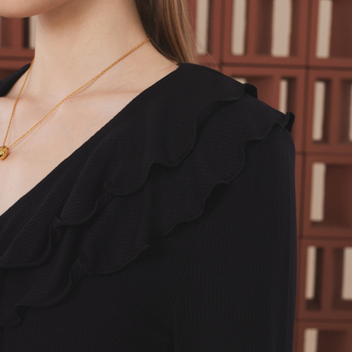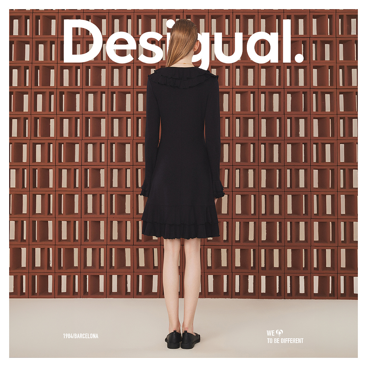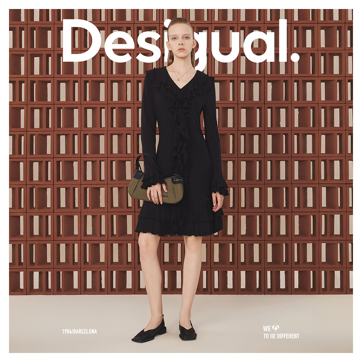 Desigual坑条面料多层荷叶边V领长袖 连衣裙 中长款