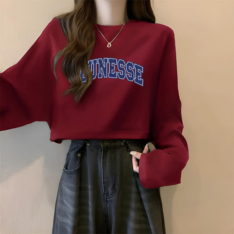 长袖 宽松打底衫 t恤女ins春秋季 学生韩版 上衣潮 新款 酒红色纯棉短款