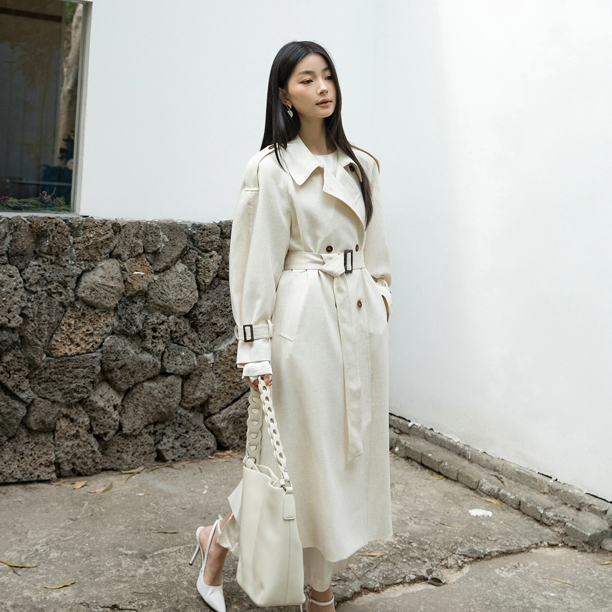 日本温柔复古风亚麻棉中长款 秋气质外套6376 风衣双排扣宽松大码