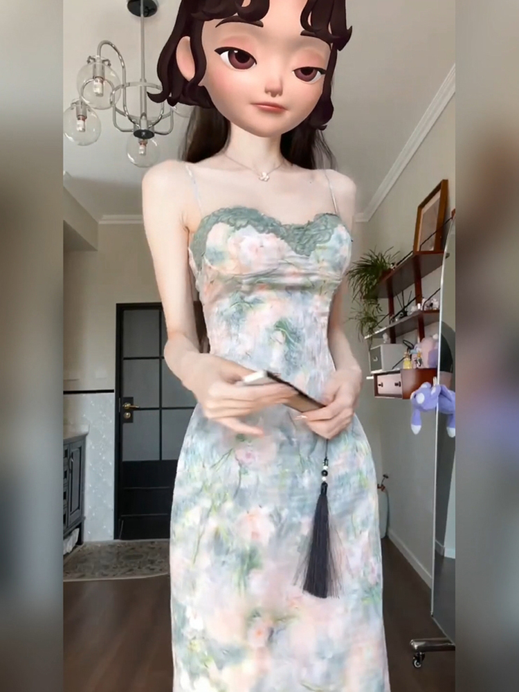 胖mm新中式 两件套 温柔性感蕾丝碎花吊带连衣裙女气质收腰长裙开衫
