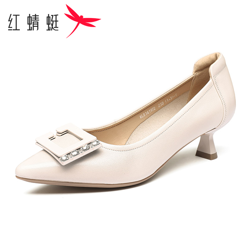 秋季 鞋 时尚 尖头浅口百搭细跟通勤正装 方扣水钻中跟单鞋 红蜻蜓女鞋