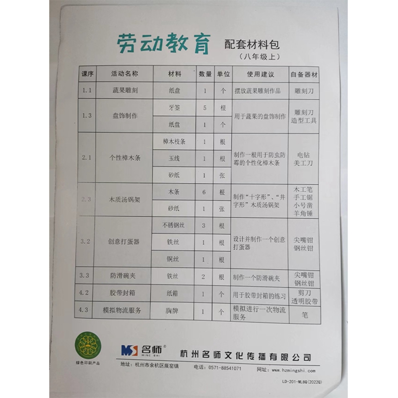 配套材料包 初中8八年级上册 浙江省义务教育教科书 浙教版 技手工制作学具劳动配套材料 劳动教具 杭州名师文化 2023年