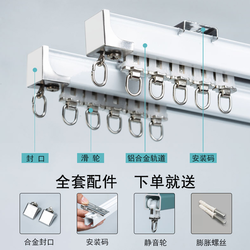 铝合金窗帘轨道静音滑轨窗帘杆导轨单轨双轨侧装 滑道轴承滑轮 顶装