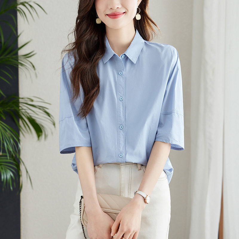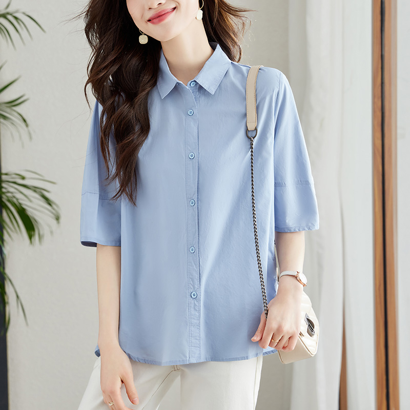 新款 夏装 简约精致上衣纯棉通勤衬衣 女五分袖 初影淡蓝色衬衫