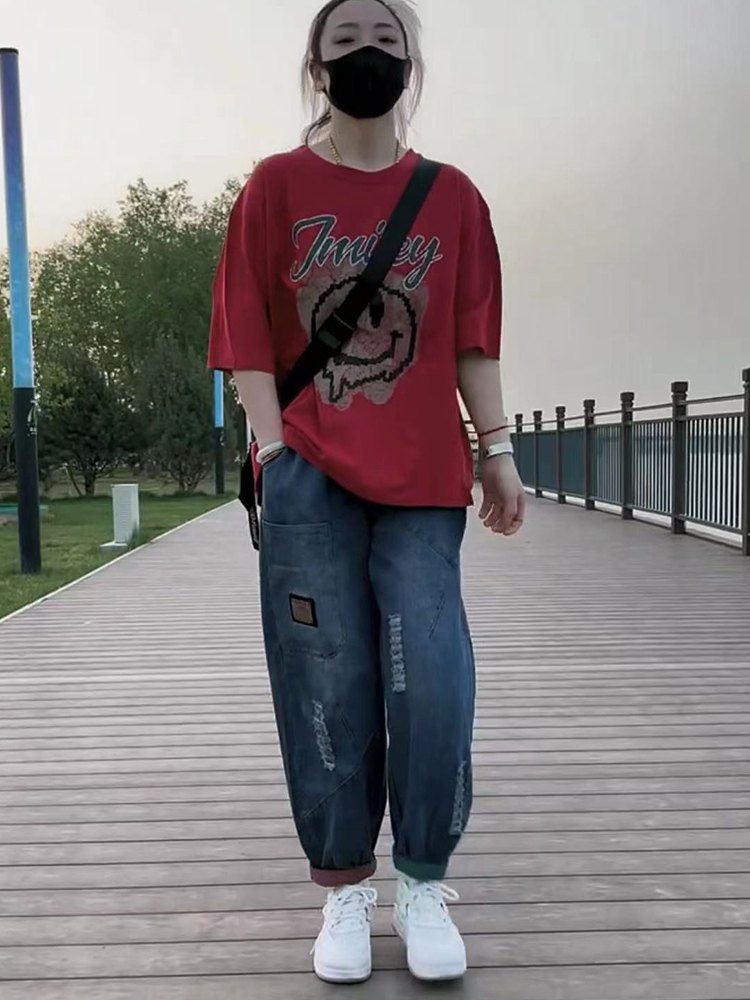 T恤 印花短袖 水洗爆款 牛仔哈伦裤 女 2025年夏季 两件套装 新款