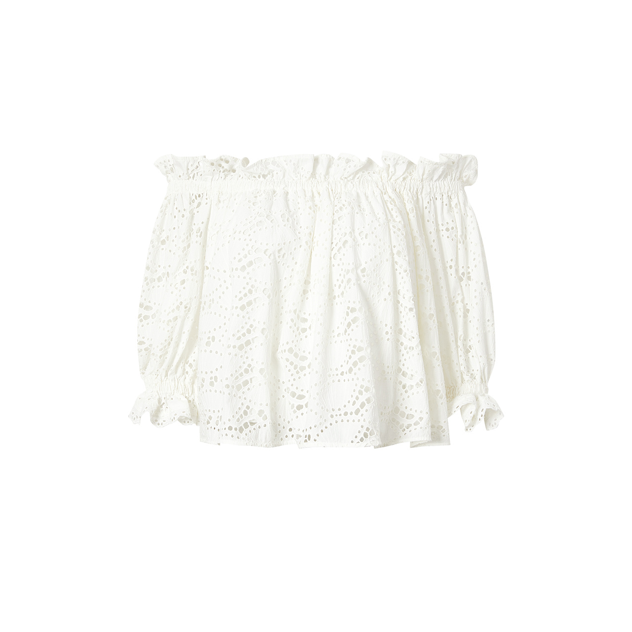 小衫 清凉镂空甜美一字肩白色衬衫 短上衣女 法式 摩萨克夏季