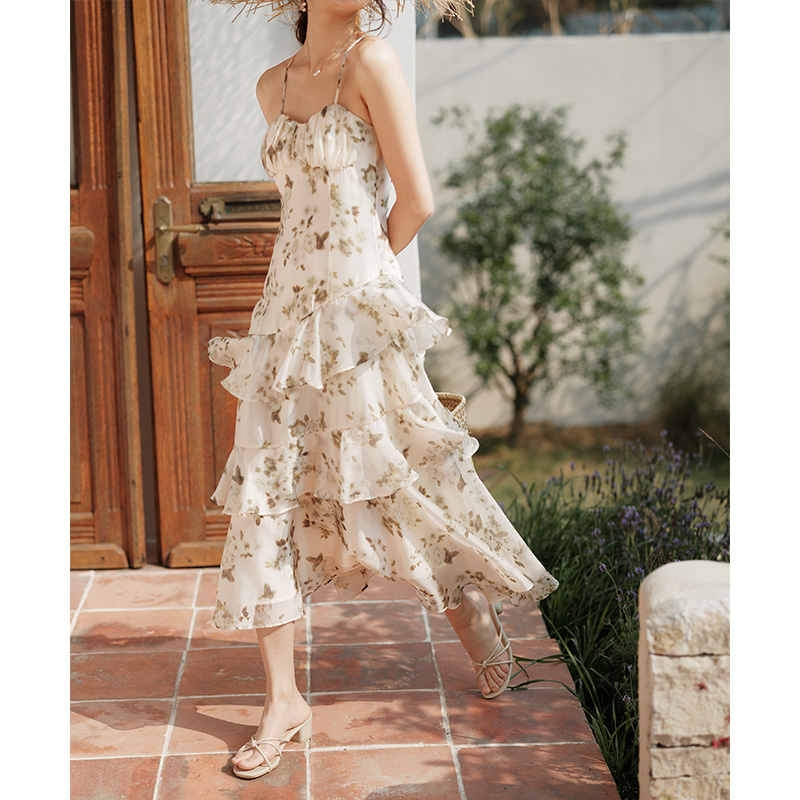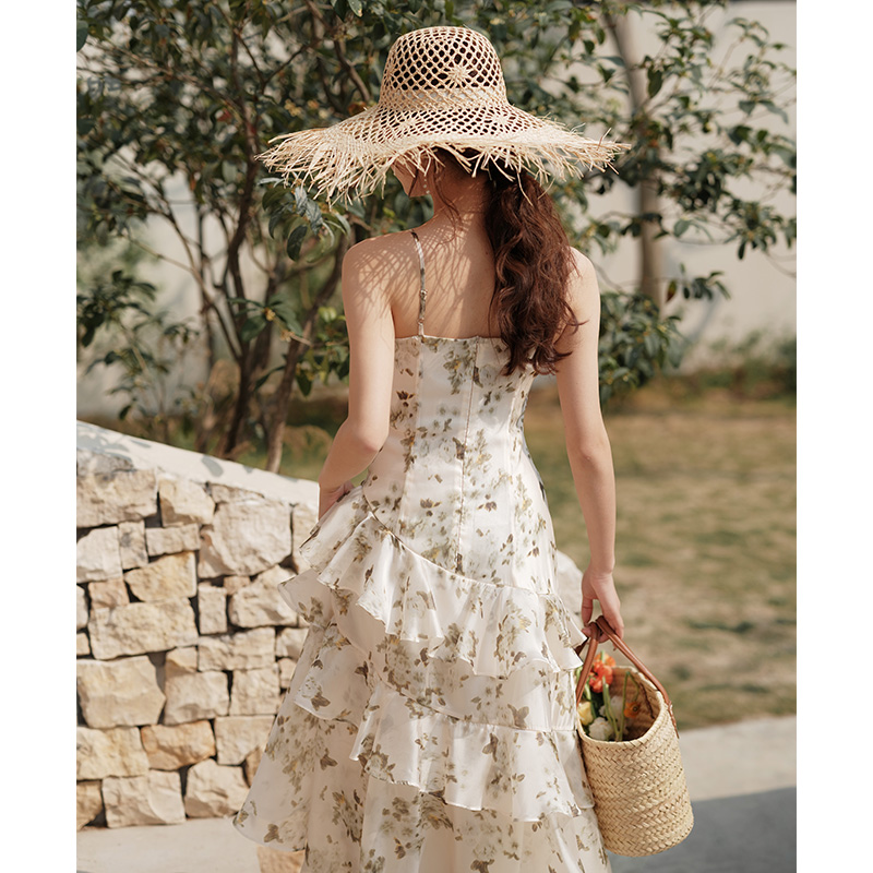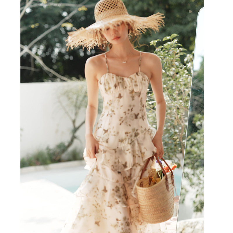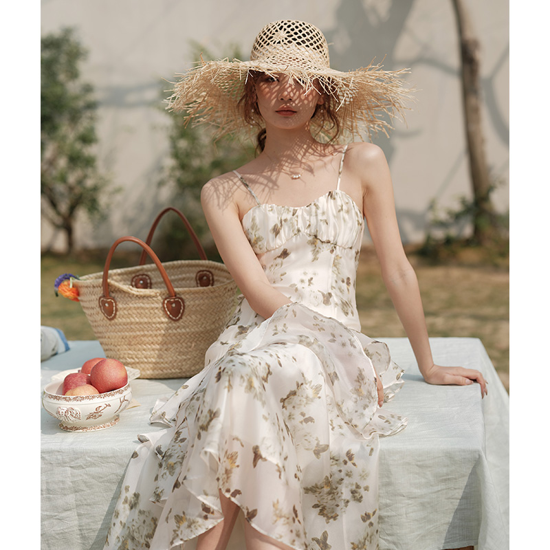 椿山密语叶舒华同款 赫本风海边沙滩裙碎花收腰连衣裙 吊带长裙法式