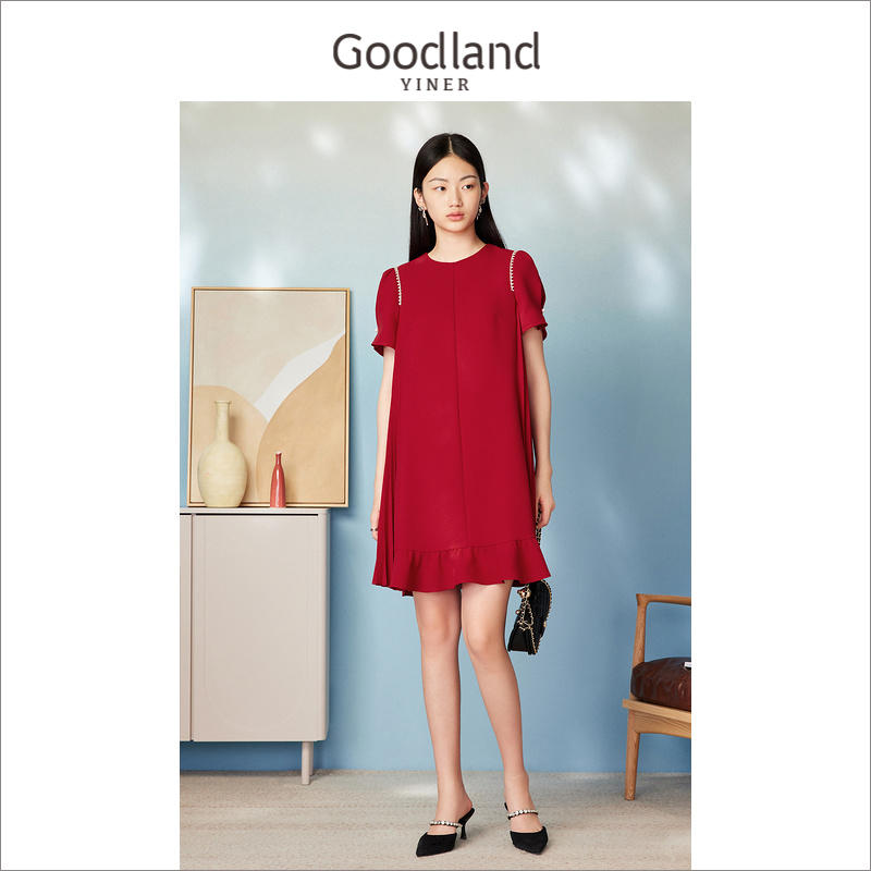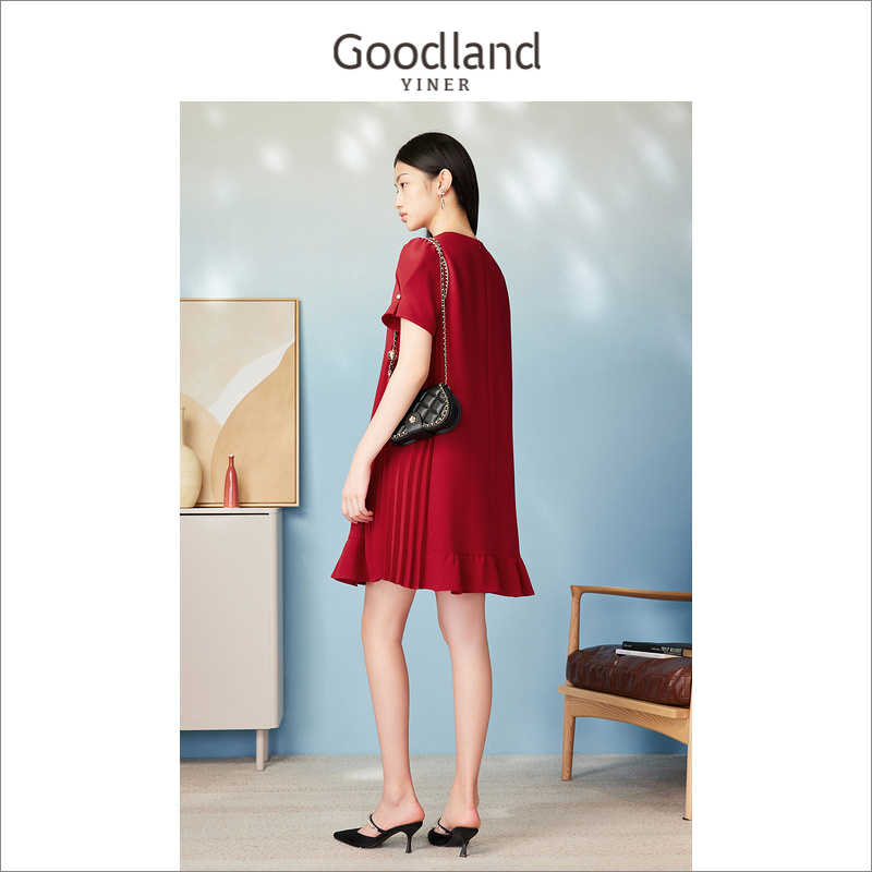 夏季 Goodland美地女装 升级 红色压褶h型连衣裙 爆款