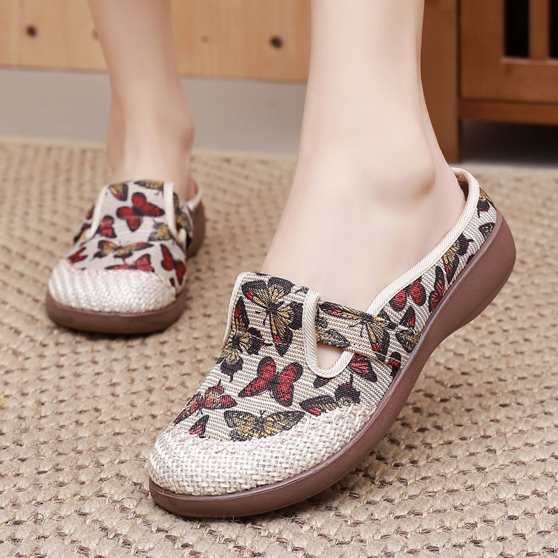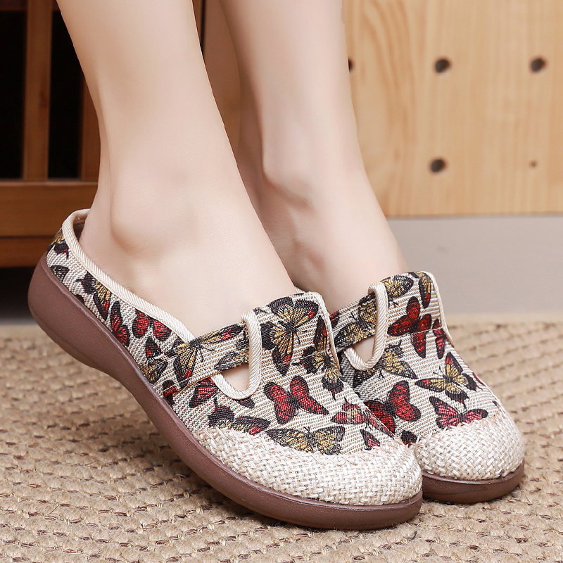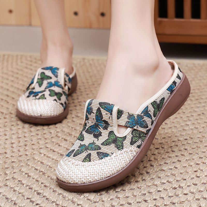软底厚底亚麻布拖鞋 外穿复古民族风妈妈鞋 女包头半拖鞋 老北京布鞋