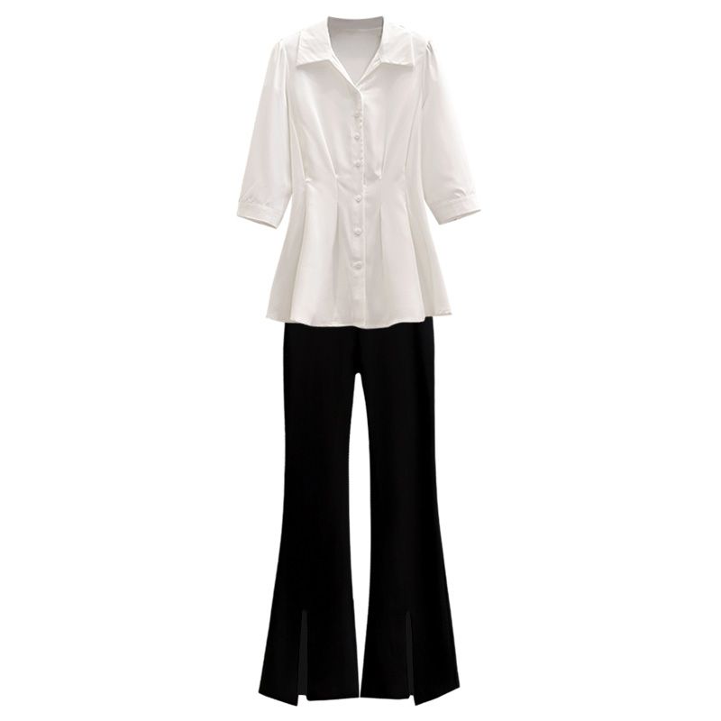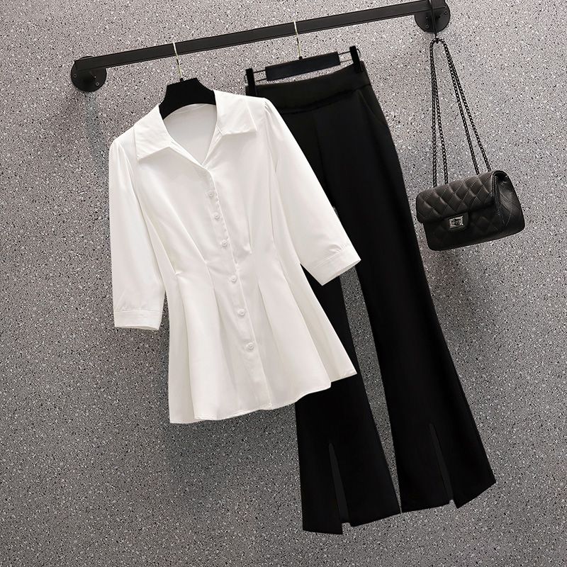 女胖mm遮肚藏肉套装 上衣微喇裤 巨显瘦梨型身材中长款 衬衫 短袖 大码