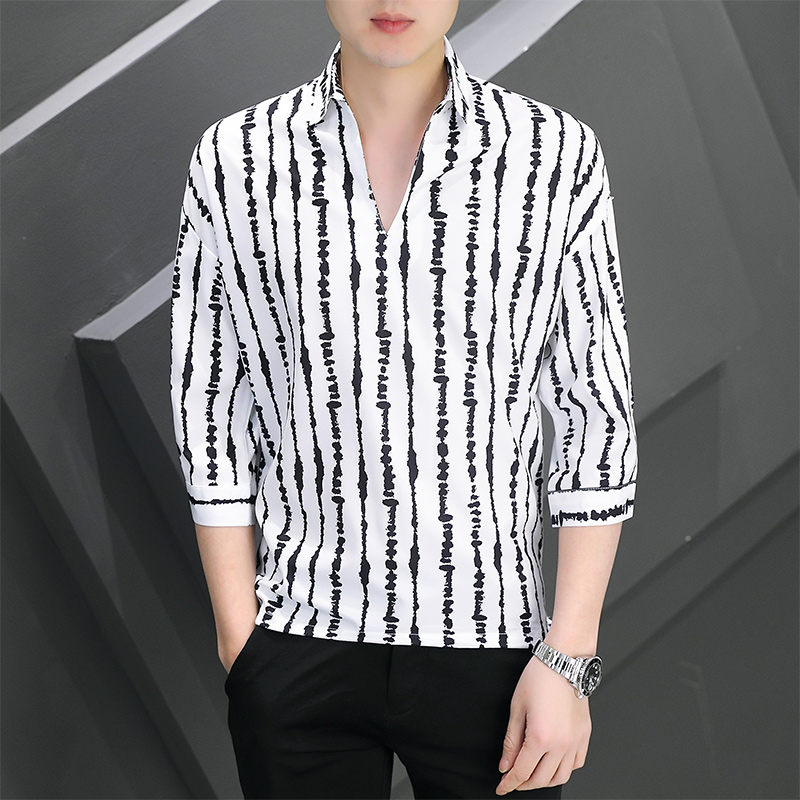 宽松冰丝短袖 t恤男士 条纹polo衫 夏季 运动上衣服 衬衫 中袖 v领七分袖