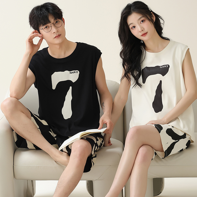 可人儿夏季 情侣纯棉睡衣夏天休闲圆领背心运动外穿男女家居服套装