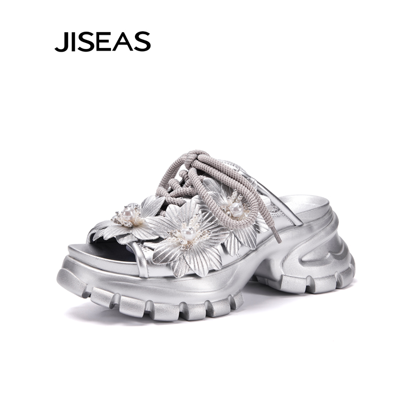 真皮增高轻便休闲凉鞋 新款 2024夏季 JISEAS小众设计感厚底花朵拖鞋