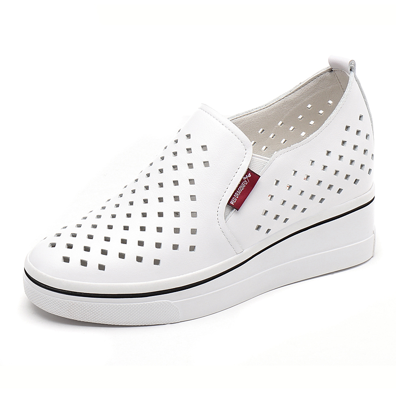 套脚坡跟厚底女鞋 真皮内增高单鞋 百搭镂空乐福鞋 红蜻蜓简约小白鞋