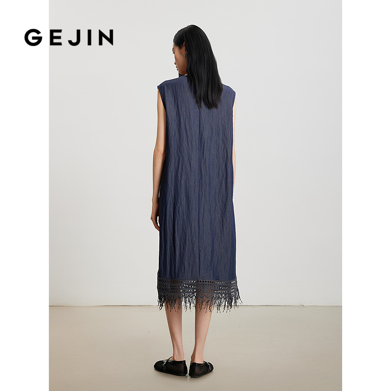 黑色连衣裙女18465922 假两件拼接宽松圆领短袖 设计师款 佐丹奴新款
