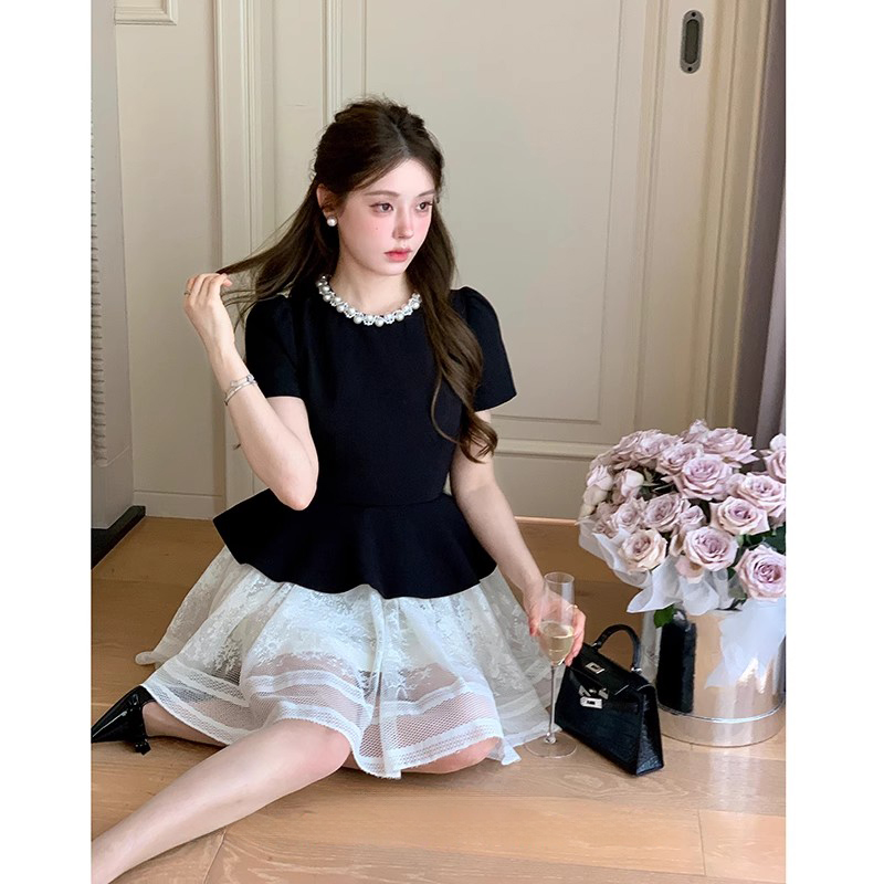 连衣裙女13465307 拼接小黑裙极简风圆领短袖 佐丹奴裙子女夏季 新款