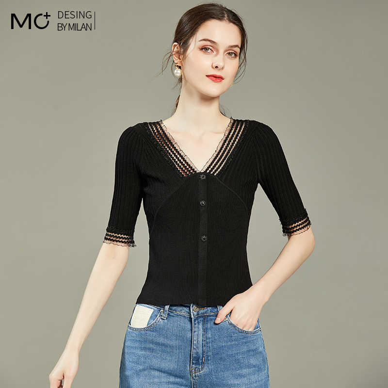 针织衫 修身 女中袖 绣花v领设计感小众短袖 上衣 2025春装 装 新款