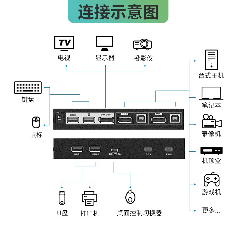 配线键盘热键切换自动切换器 KVM切换器2口DP二进一出电脑显示器USB键盘鼠标共享器2进1出 迈拓维矩MT PK201