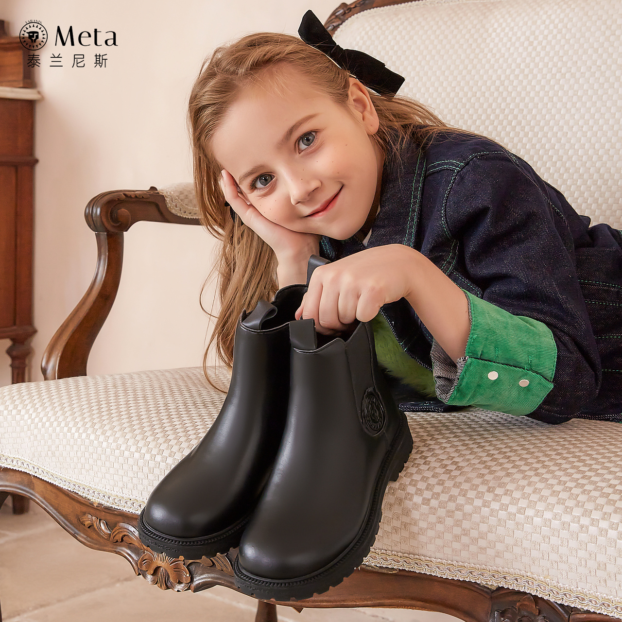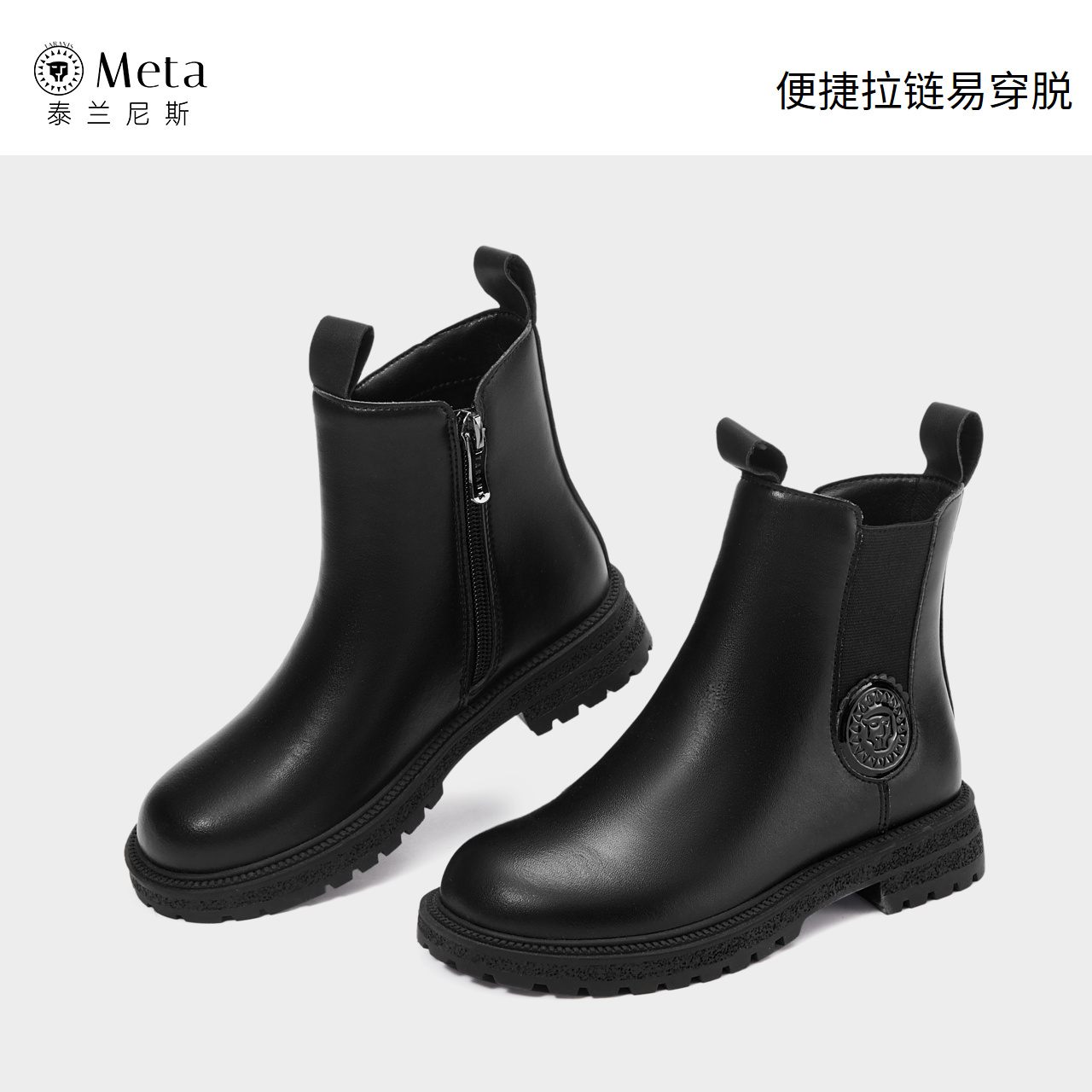 泰兰尼斯meta儿童鞋 黑色马丁靴女童切尔西短靴中大童单靴 秋季