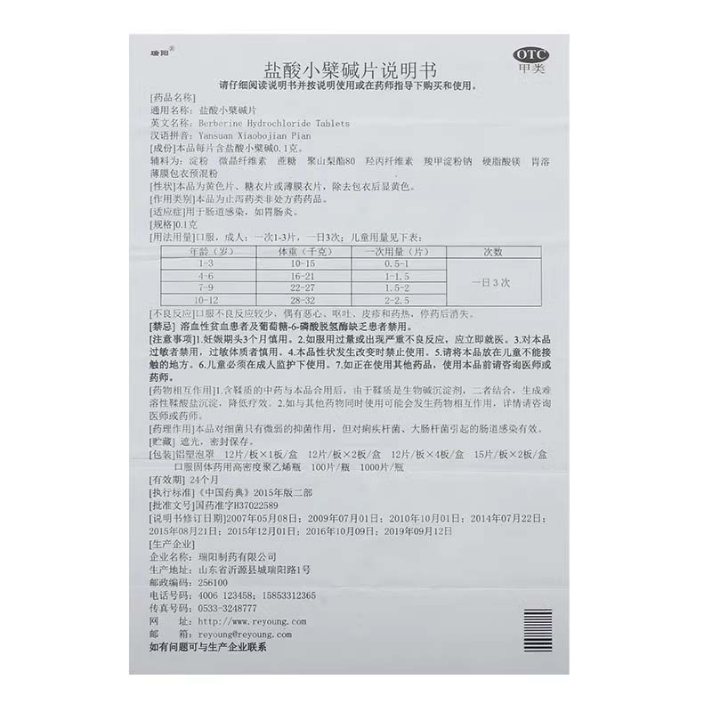 瑞阳盐酸小檗碱片24片盐酸小檗碱片治疗肠胃炎 口服 药胃肠炎正品