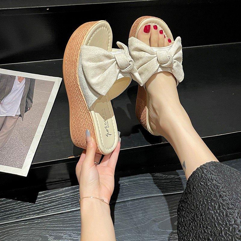 女坡跟厚底防水台超高跟一字拖鞋 2023春夏季 凉拖鞋 蝴蝶结大码 新款