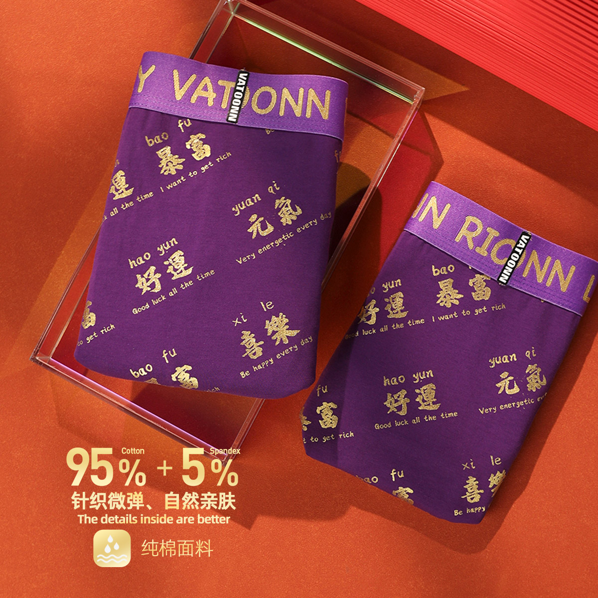 礼盒装 纯棉男女紫色多财吉庆中腰收腹宽腰带抑菌裆 新年情侣内裤