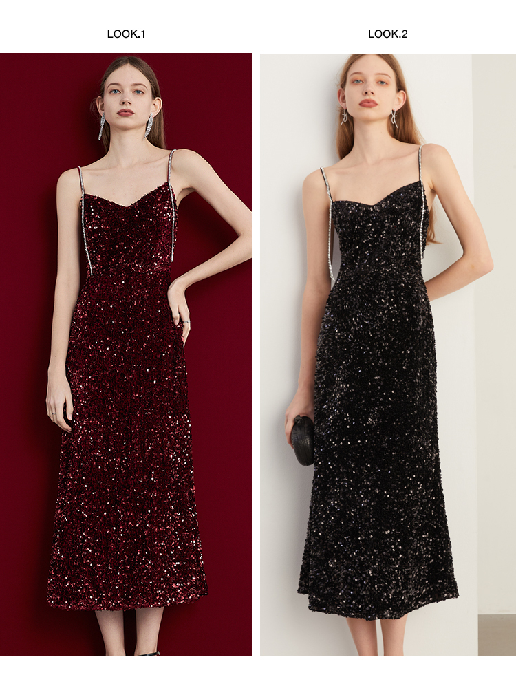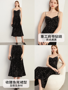 DPLAY2025秋季 黑色连衣裙女亮片吊带鱼尾裙闪钻晚礼服裙子 新款