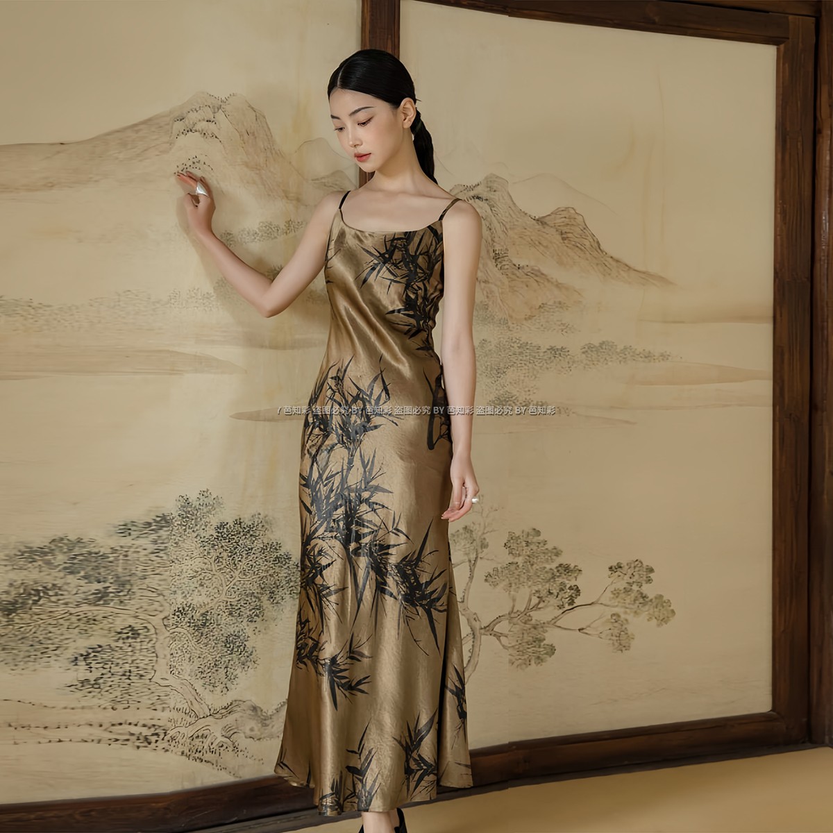 重磅醋酸复古竹子提花改斜裁吊带裙温柔新中式 2664 气质连衣裙