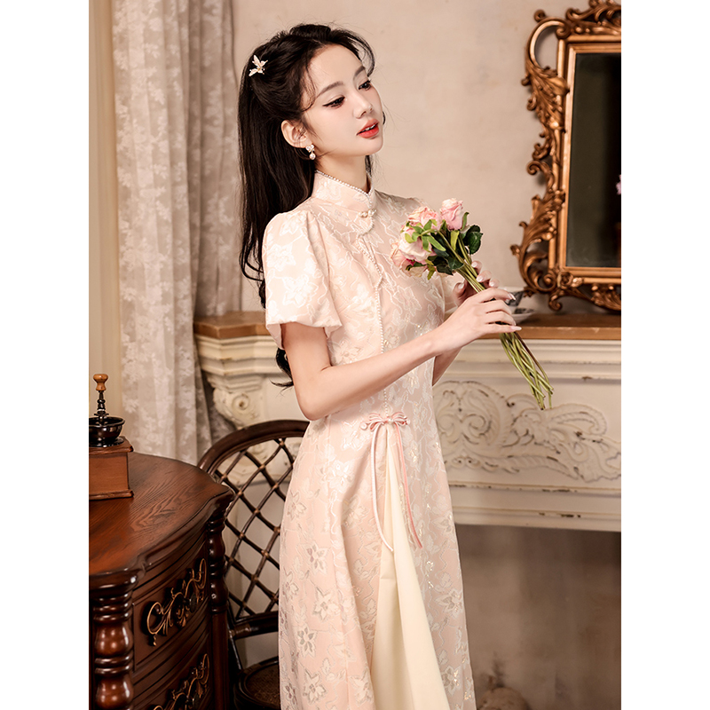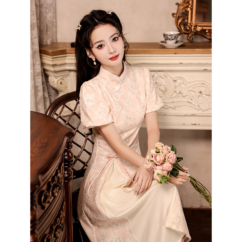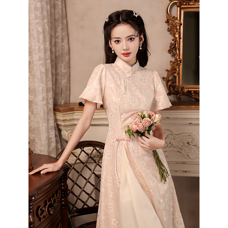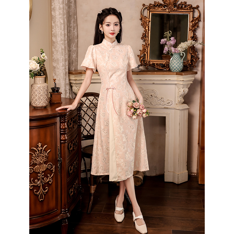 粉色国风订婚连衣裙夏茶服 2025新款 新中式 改良奥黛旗袍少女年轻款