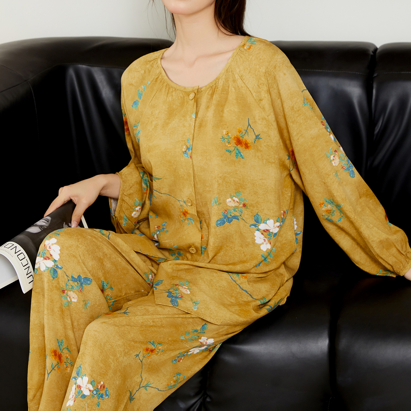 人造棉可外穿家居服春秋季 国风棉绸睡衣女夏季 宽松薄款 新中式 套装