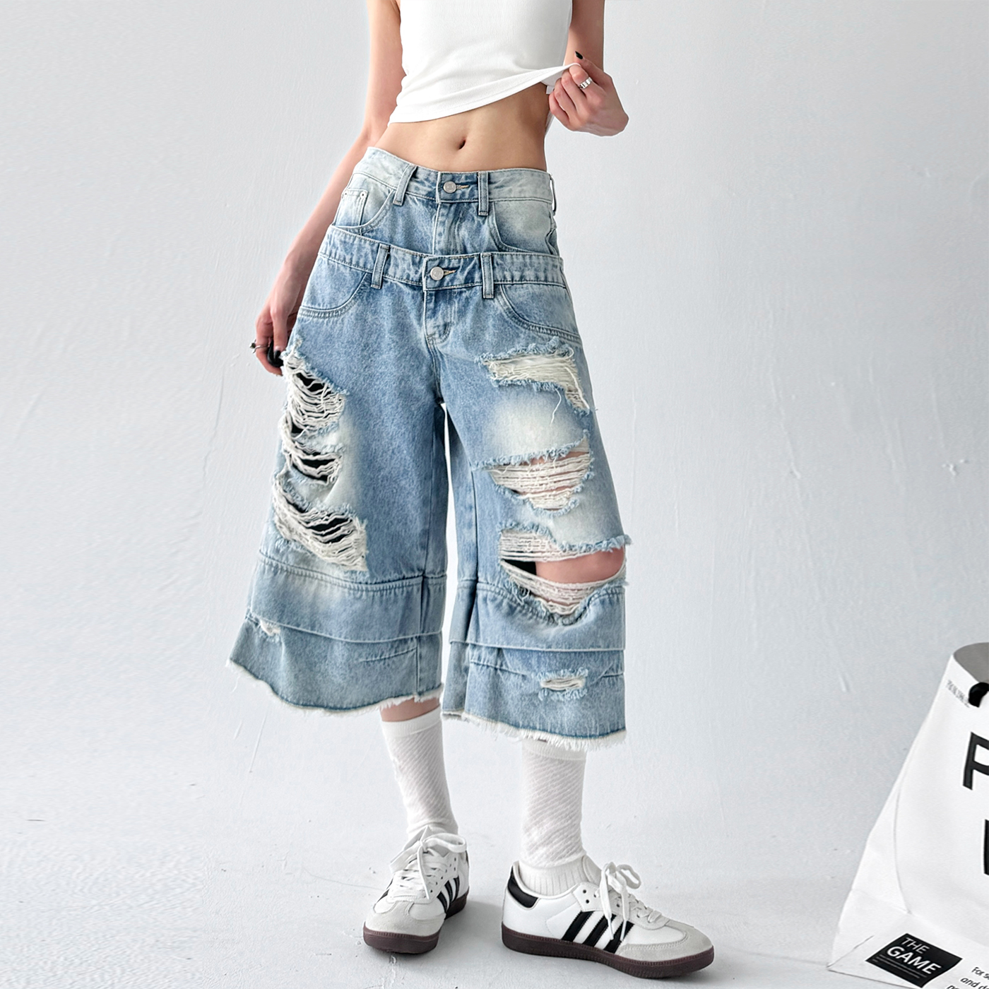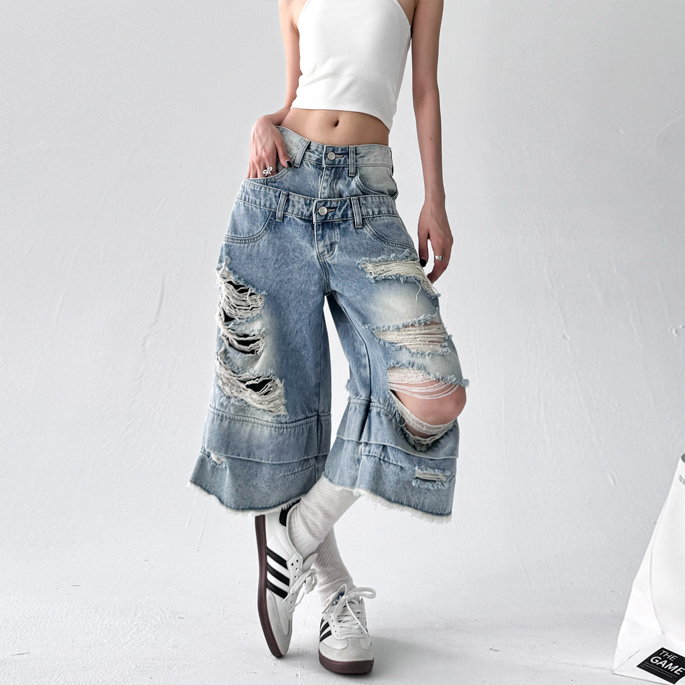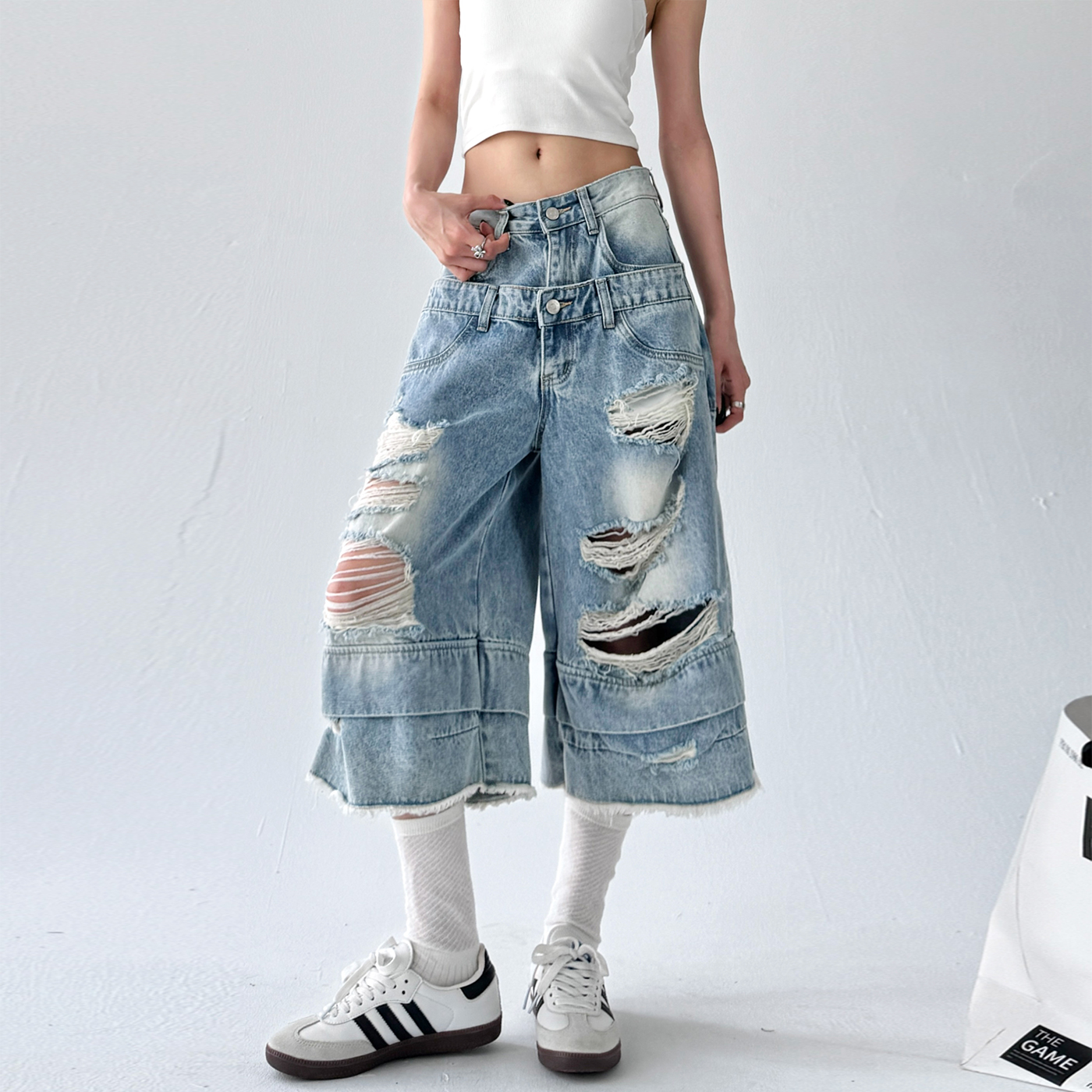 高腰直筒宽松中裤 新款 女2025夏季 复古街头蓝色破洞双腰牛仔七分裤