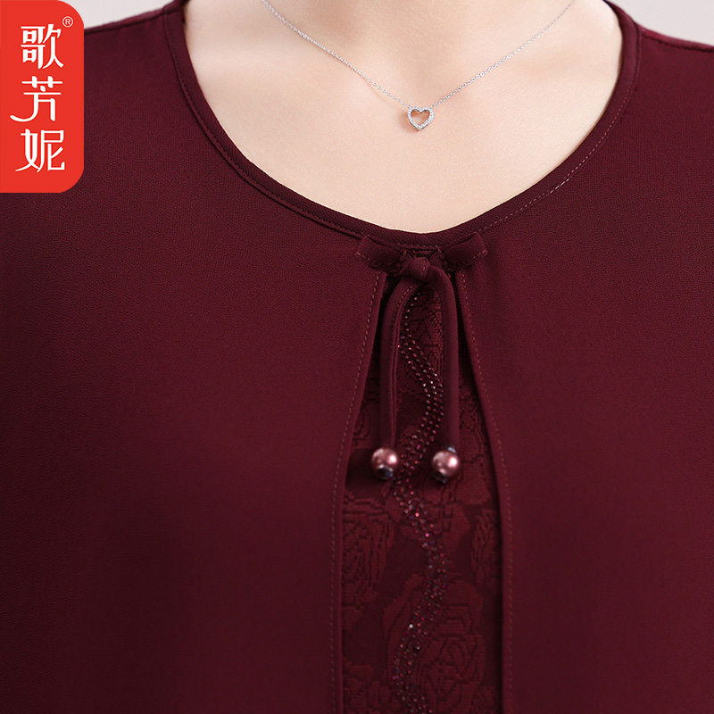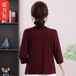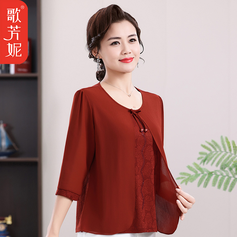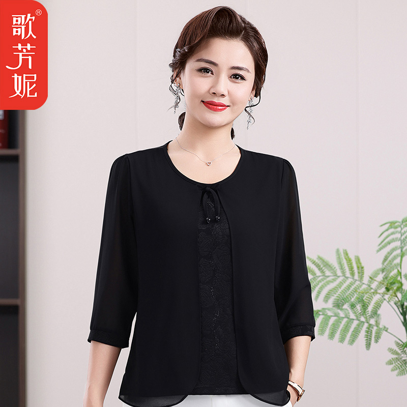 洋气小衫 2025中老年女装 妈妈夏季 假两件上衣2025新款 T恤 雪纺短袖