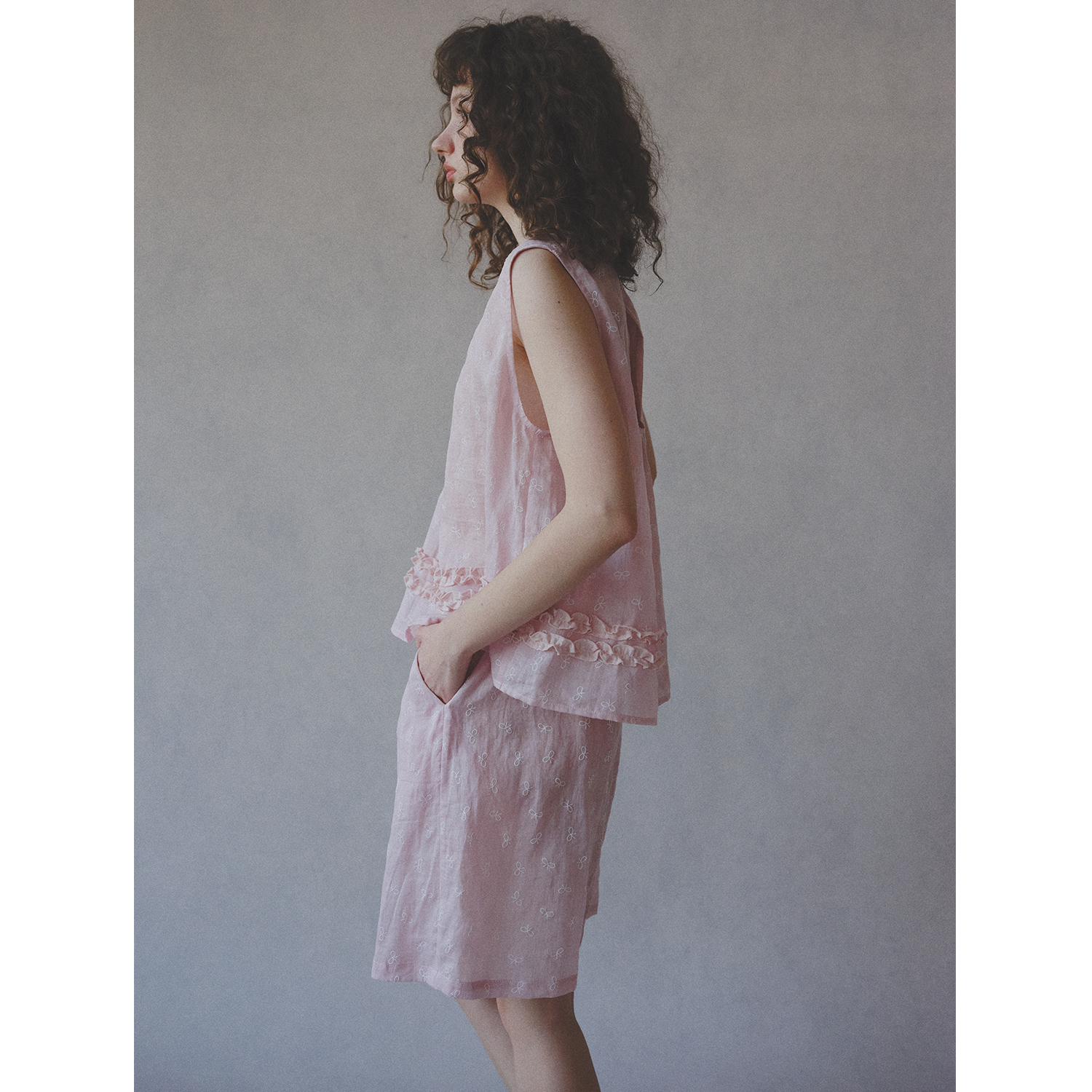 MollyRosa樱花粉天然100支苎麻睡衣女蝴蝶结凉爽五分裤 家居服套装
