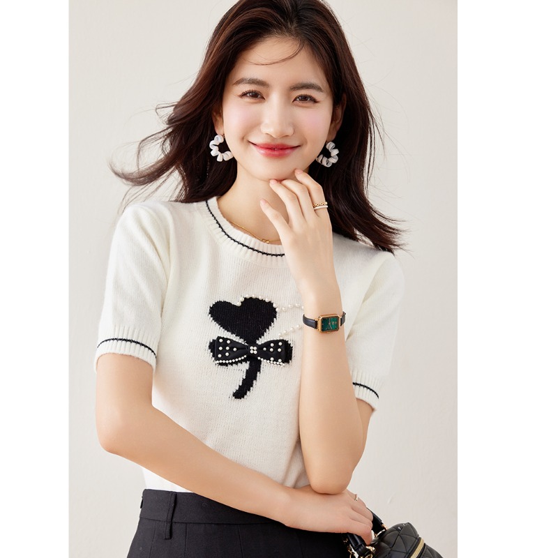 小香风钉珠蝴蝶结冰丝针织衫 2025新款 超火减龄上衣 t恤女夏季 短袖