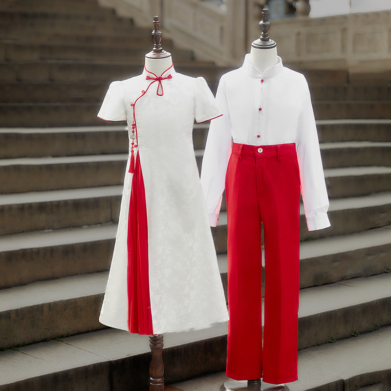 女童旗袍男童西装 国风主持人礼服中国风红歌大合唱运动会晚会 套装